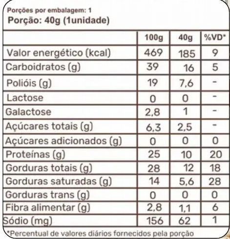 Ingredientes: Mix de proteínas: (proteína concentrada do soro do leite zero lactose, proteína isolada de soro do leite zero lactose, colágeno hidrolisado e clara de ovo em pó), amendoim torrado, leite integral em pó zero lactose, gordura vegetal, fibra solúvel: polidextrose, biscoito sabor cacau: (farinha de arroz, fécula de batata, amido de milho e cacau em pó), sal, emulsificantes: (lecitina de soja e poliglicerol polirricinoleato) e edulcorantes: (maltitol e stevia), fermento químico: bicarbonato de sódio, aromatizantes e antioxidante: (vitamina E - tocoferol). NÃO CONTÉM GLÚTEN. NÃO CONTÉM LACTOSE. ALÉRGICOS: CONTÉM AMENDOIM, OVO, DERIVADOS DE LEITE E DE SOJA. PODE CONTER: AMÊNDOAS, AVELÃ, PISTACHE E CASTANHA-DE-CAJU.