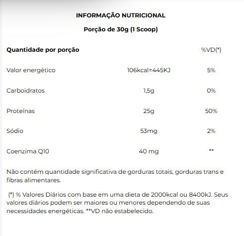 Ingredientes: Proteína Isolada do Soro de Leite (WPI), Proteína Hidrolisada do Soro do leite (WPH), Coenzima Q10, Espessante Goma Xantana, Antiumectante Dióxido de Silício, Edulcorante Glicosídeo Steviól (Stévia rebaudiana). BAUNILHA: Aromatizante Natural de Flor de Baunilha. CHOCOLATE: Cacau em pó. MORANGO: Aromatizante Natural de Morango e Corante Natural Carmin. NÃO CONTÉM GLÚTEN. NÃO CONTÉM LACTOSE. ALÉRGICOS: CONTÉM DERIVADO DO LEITE. PODE CONTER DERIVADOS DO OVO E SOJA. *Produzido em equipamento onde se processam estes alimentos.