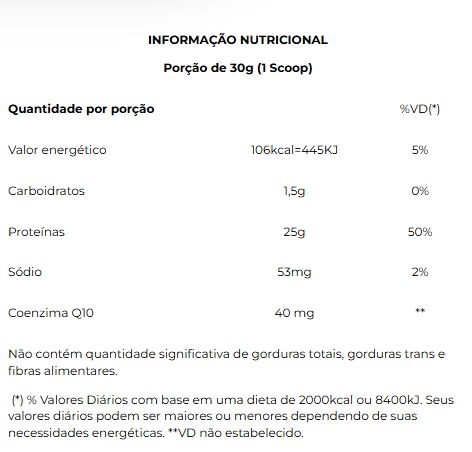 Ingredientes: Proteína Isolada do Soro de Leite (WPI), Proteína Hidrolisada do Soro do leite (WPH), Coenzima Q10, Espessante Goma Xantana, Antiumectante Dióxido de Silício, Edulcorante Glicosídeo Steviól (Stévia rebaudiana). BAUNILHA: Aromatizante Natural de Flor de Baunilha. CHOCOLATE: Cacau em pó. MORANGO: Aromatizante Natural de Morango e Corante Natural Carmin. NÃO CONTÉM GLÚTEN. NÃO CONTÉM LACTOSE. ALÉRGICOS: CONTÉM DERIVADO DO LEITE. PODE CONTER DERIVADOS DO OVO E SOJA. *Produzido em equipamento onde se processam estes alimentos.