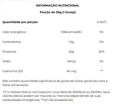 Ingredientes: Proteína Isolada do Soro de Leite (WPI), Proteína Hidrolisada do Soro do leite (WPH), Coenzima Q10, Espessante Goma Xantana, Antiumectante Dióxido de Silício, Edulcorante Glicosídeo Steviól (Stévia rebaudiana). BAUNILHA: Aromatizante Natural de Flor de Baunilha. CHOCOLATE: Cacau em pó. MORANGO: Aromatizante Natural de Morango e Corante Natural Carmin. NÃO CONTÉM GLÚTEN. NÃO CONTÉM LACTOSE. ALÉRGICOS: CONTÉM DERIVADO DO LEITE. PODE CONTER DERIVADOS DO OVO E SOJA. *Produzido em equipamento onde se processam estes alimentos.