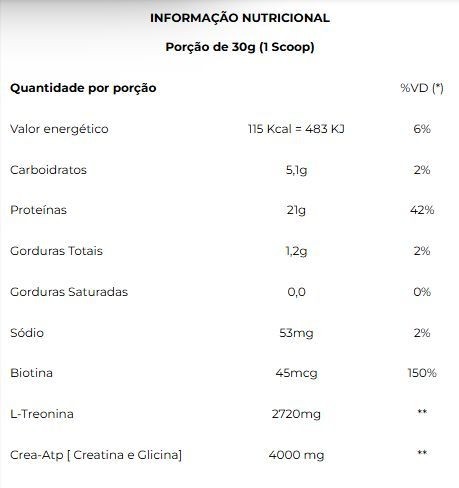 Ingredientes: Proteína Concentrada do Soro do leite (WPC), Crea-Atp [Creatina e Glicina], L-Treonina, Biotina, Espessante Goma Xantana, Edulcorante Glicosídeo Steviól (Stévia Rebaudiana). Chocolate: Cacau em Pó. Baunilha: Aroma Natural de Baunilha. Morango: Aroma Natural de Morango e Corante Natural Carmin. Leite Condensado: Aroma Sintético Idêntico ao Natural de Leite Condensado. Goma Xantana e Edulcorante Glicosídeo Steviól (Stévia Rebaudiana). NÃO CONTÉM GLÚTEN. CONTÉM LACTOSE. ALÉRGICOS: CONTÉM DERIVADO DO LEITE. PODE CONTER TRAÇOS DE SOJA*. *Produzido em equipamento onde se processam estes alimentos, contudo, ações preventivas de limpeza são adotadas para evitar essa ocorrência.
