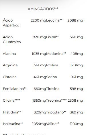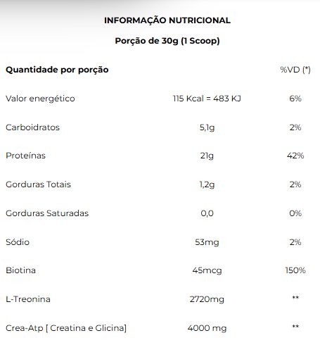 Ingredientes: Proteína Concentrada do Soro do leite (WPC), Crea-Atp [Creatina e Glicina], L-Treonina, Biotina, Espessante Goma Xantana, Edulcorante Glicosídeo Steviól (Stévia Rebaudiana). Chocolate: Cacau em Pó. Baunilha: Aroma Natural de Baunilha. Morango: Aroma Natural de Morango e Corante Natural Carmin. Leite Condensado: Aroma Sintético Idêntico ao Natural de Leite Condensado. Goma Xantana e Edulcorante Glicosídeo Steviól (Stévia Rebaudiana). NÃO CONTÉM GLÚTEN. CONTÉM LACTOSE. ALÉRGICOS: CONTÉM DERIVADO DO LEITE. PODE CONTER TRAÇOS DE SOJA*. *Produzido em equipamento onde se processam estes alimentos, contudo, ações preventivas de limpeza são adotadas para evitar essa ocorrência.