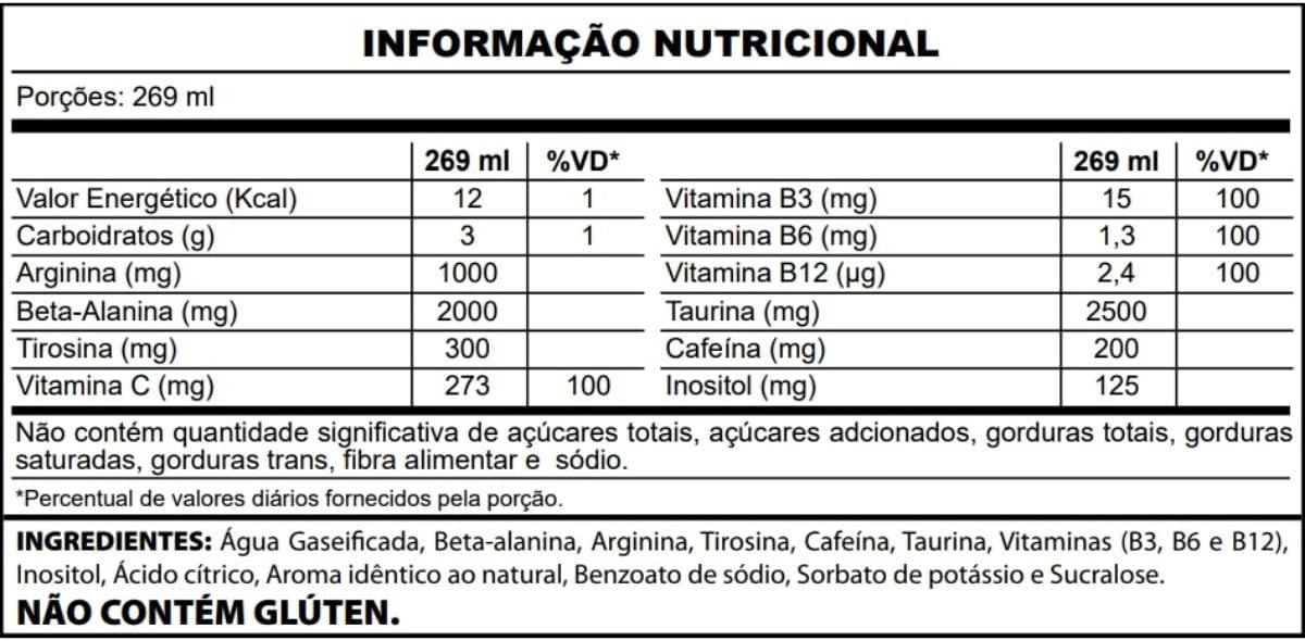 gaseificada, beta-alanina, arginina, tirosina, cafeína, taurina, vitaminas (B3,