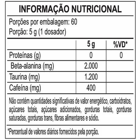 Ingredientes: Beta-alanina, taurina, cafeína, acidulante ácido cítrico, aromatizante, antiumectante dióxido de silício, edulcorante sucralose e corantes amarelo crepúsculo FCF e ponceau 4R. NÃO CONTÉM GLÚTEN.