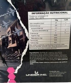 Ingredientes: Cloridrato de L-arginina, beta-alanina, taurina, taurato de magnésio, maltodextrina, L-tirosina, inositol, coenzima Q10, nicotinamida, pantotenato de cálcio, cloridrato de piridoxina, biotina, mononitrato de tiamina, riboflavina, ácido fólico, cianocobalamina, acidulante ácido cítrico, antiumectante dióxido de silício e fosfato tricálcico, agente de massa glicerol, aromatizantes naturais beterraba em pó e melancia em pó, aromatizante idêntico ao natural, edulcorante sucralose e acessulfame de potássio, corante tartrazina e azul brilhante FCF.