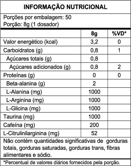 Ingredientes:  Beta-Alanina, L-Alanina, L-Arginina, L-Citrulina, Glicina, Taurina e Cafeína.