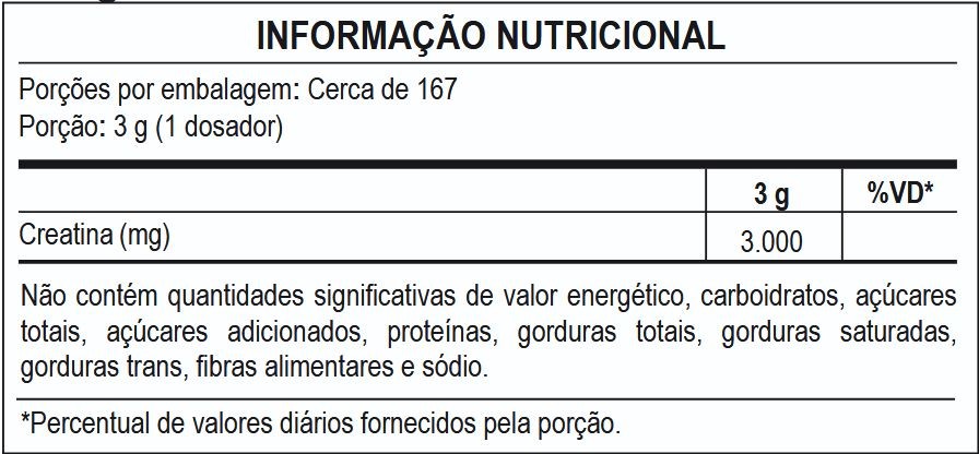 Ingredientes: Creatina monohidratada e antiumectante dióxido de silício. NÃO CONTÉM GLÚTEN.