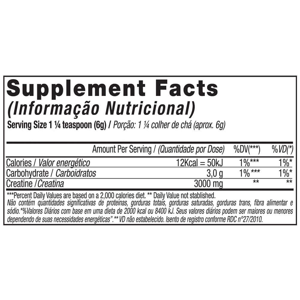 Ingredientes: Creatina Monohidratada e maltodextrina. ALÉRGICOS: PODE CONTER LEITE, OVO, AMENDOIM, SOJA, TRIGO E SEUS DERIVADOS. NÃO CONTÉM GLÚTEN.