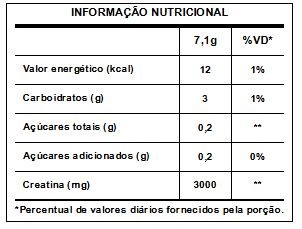 Ingredientes: Creatina monohidratada, maltodextrina, acidulante ácido cítrico, antiumectante dióxido de silício, aromatizante, edulcorante sucralose e Corante tartrazina e azul brilhante FCF.
