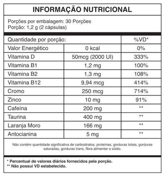 Ingredientes: Taurina, cafeína, extrato de laranja moro (Citrus sinensis L. Osbeck), bisglicinato de zinco, picolinato de cromo, colecalciferol (vitamina D), riboflavina (vitamina B2), cloridrato de tiamina (vitamina Bl), metilcobalamina (vitamina B12), dióxido de silício, estearato de magnésio e silicato de magnésio. CÁPSULAS? Gelatina, água purificada e corantes azorrubina, amarelo de quinoleína, ponceau 4R e dióxido de titânio. NÃO CONTÉM GLÚTEN.