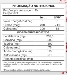 Ingredientes: Taurina, bitartarato de colina (vitamina B8), L-fenilalanina, aroma idêntico ao natural de frutas vermelhas, café verde em pó, cafeína, L-carnitina, extrato de laranja moro (Citrus sinensis L. Osbeck), guaraná em pó (Paullinia cupana), extrato de chá verde em pó, gengibre em pó, hibisco em pó, extrato de cranberry em pó, picolinato de cromo, água purificada, glicerina bidestilada, ácido tartárico, acidulantes stevia e sucralose, corantes artificiais vermelho carmim (INS 120) e conservantes benzoato de sódio (INS 211) e sorbato de potássio (INS 202). NÃO CONTÉM GLÚTEN e LACTOSE.