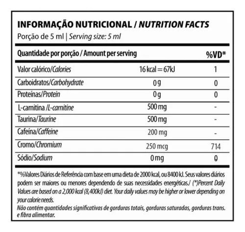 Ingredientes: Água purificada, tartarato de L-carnitina, taurina,