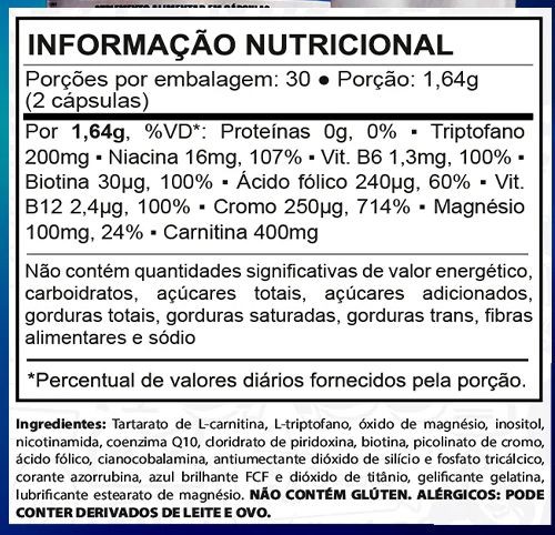 Ingredientes: Tartarato de L-carnitina, L-triptofano, óxido de magnésio, inositol, nicotinamida, coenzima Q10, cloridrato de piridoxina, biotina, picolinato de cromo, ácido fólico, cianocobalamina, antiumectante dióxido de silício e fosfato tricálcico, corante azorrubina, azul brilhante FCF e dióxido de titânio, gelificante gelatina, lubrificante estearato de magnésio. NÃO CONTÉM GLÚTEN. ALÉRGICOS: PODE CONTER DERIVADOS DE LEITE E OVO.