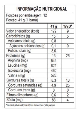 Ingredientes: Blend de proteínas (proteína concentrada do soro do leite (WPC), colágeno hidrolisado, caseína e caseinato de cálcio), cobertura proteica sabor chocolate ao leite, recheio de ganache sabor caramelo, óleo de girassol, polidextrose, TCM, sal, edulcorante xarope de maltitol, umectante glicerina, emulsificante lecitina de girassol, aromatizantes e conservador sorbato de potássio. CONTÉM GLÚTEN.