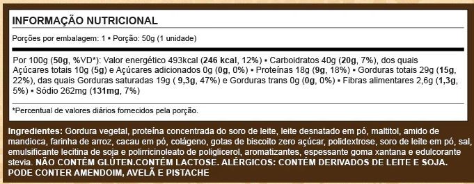 cacau em pó, colágeno, gotas de biscoito zero açúcar, polidextrose, soro de
