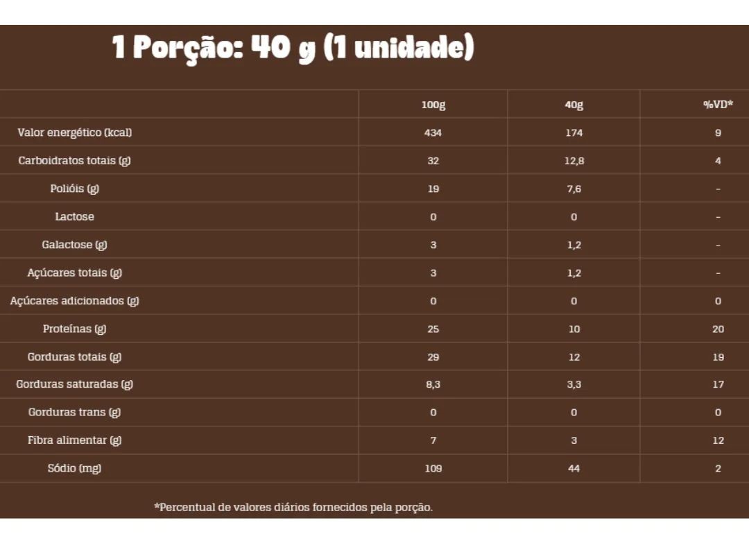 Ingredientes: Mix proteína: (proteína concentrada do soro do leite zero lactose, colágeno hidrolisado, clara de ovo em pó, ovo em pó), gordura vegetal, leite integral em pó zero lactose, farinha de arroz, cacau em pó, fibra solúvel: polidextrose, cacau em pó, fécula de batata, amido de milho, pasta integral de avelã, sal, edulcorantes: (maltitol e stevia), emulsificantes: (lecitina de soja e poliglicerol polirricinoleato), fermento químico: bicarbonato de sódio, aromatizantes e antioxidante: (vitamina E - tocoferol). NÃO CONTÉM GLÚTEN. NÃO CONTÉM LACTOSE. ALÉRGICOS: CONTÉM AVELÃ, OVO, DERIVADOS DE LEITE E DE SOJA. PODE CONTER: PISTACHE, AMENDOIM, AMÊNDOAS E CASTANHA-DE-CAJU.